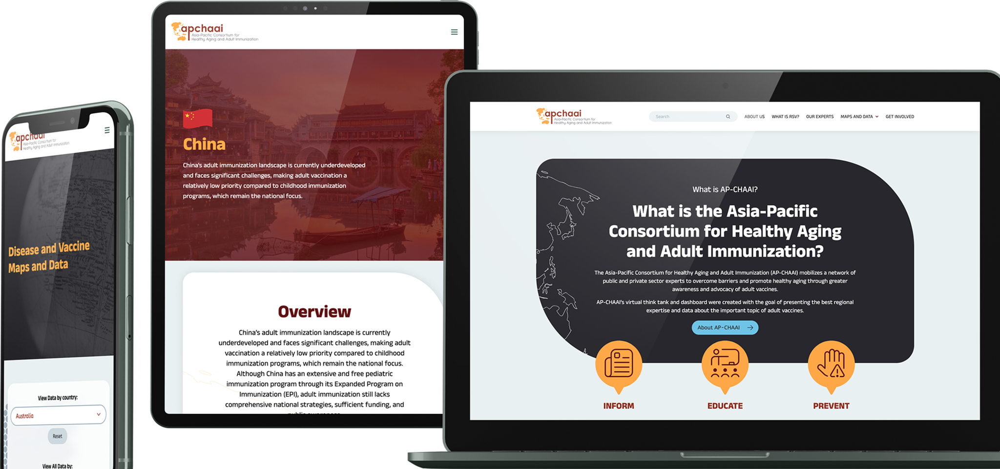 AP-CHAAI (Asia-Pacific Consortium for Healthy Aging and Adult Immunization), created by the Global Coalition on Aging, brings together public and private health experts to address immunization challenges for adults in the Asia-Pacific region. Rollin developed the consortium’s digital platform, a central hub merging organizational content with interactive regional data visualizations showing RSV disease burden and vaccine uptake.