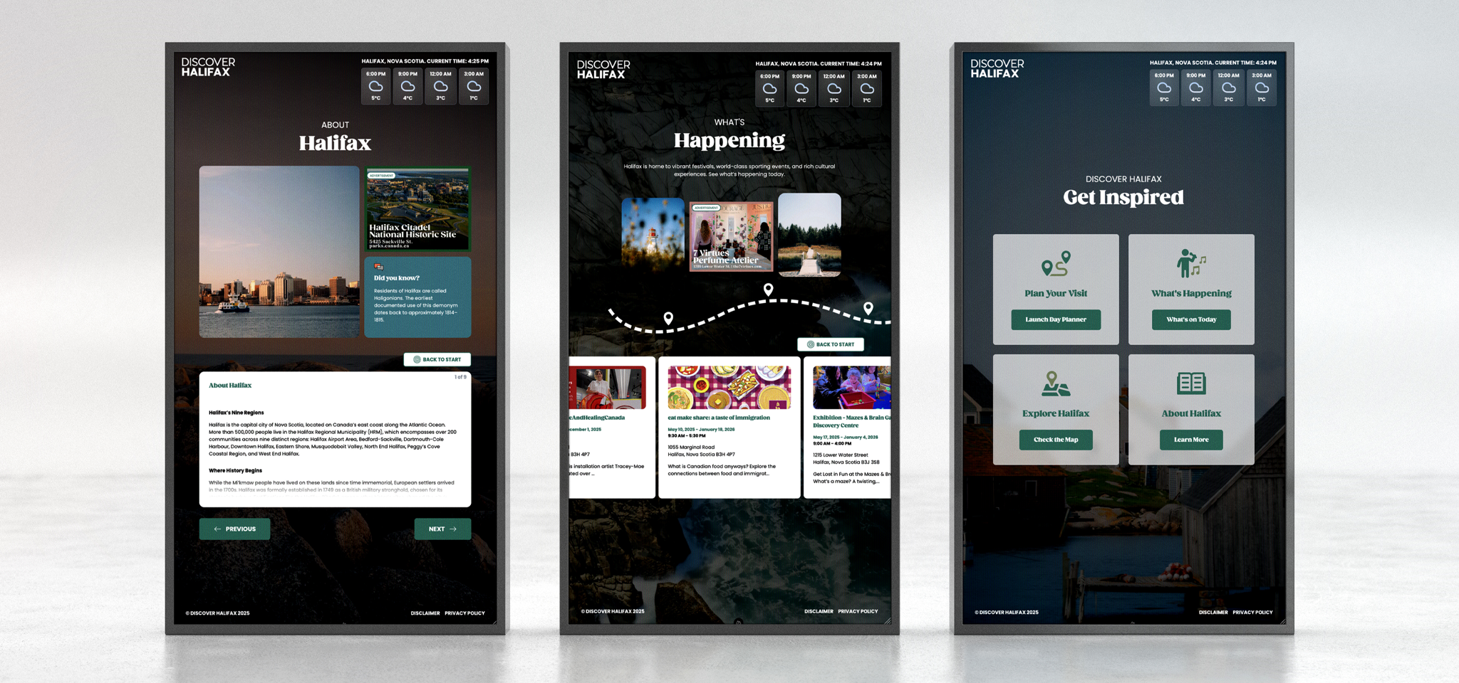 Discover Halifax sought to improve visitor reception at the port with an interactive digital kiosk. Rollin built a touchscreen interface offering personalized activity recommendations, an explorable map, real-time weather information, and an AI-powered itinerary planner. The system allows visitors to export suggestions via email or QR code to guide their city exploration.