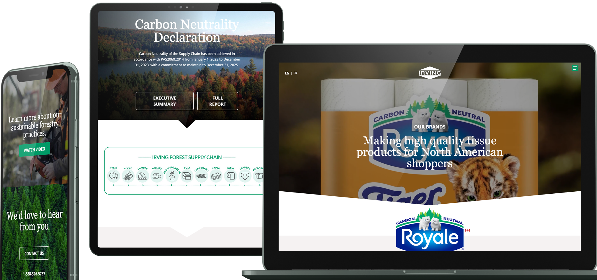 Irving Consumer Products operates manufacturing facilities across Canada and the United States, producing household paper products and baby diapers under multiple brand names. The corporate website functions as a central hub connecting product lines including Royale, Majesta, and Scotties while communicating company information to various audiences.