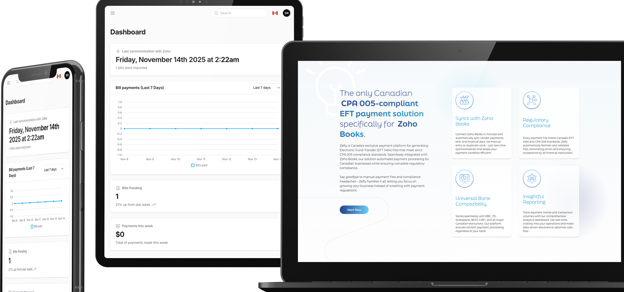 Canadian Zoho Books users lacked compliant payment infrastructure to process supplier transactions through their accounting software. Rollin partnered with NSi to develop Zefty, the first certified payment solution integrated directly into Zoho Books. Built on Symfony 5 and VueJS, the platform connects accounting workflows with authorized banking institutions across Canada.