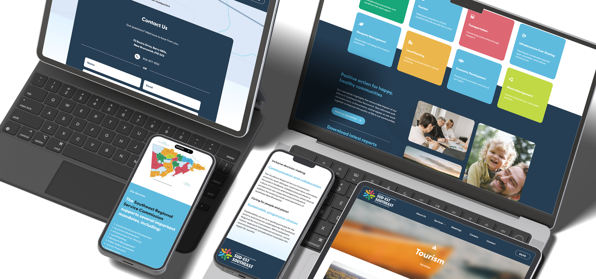 Southeast Regional Service Commission (NBSE) operates across Westmorland and Albert counties, delivering nine essential service pillars to regional communities. From municipal infrastructure and economic development to tourism promotion and transportation coordination, the organization required a unified blingual digital presence that could serve residents, businesses, board members, and regional stakeholders well.