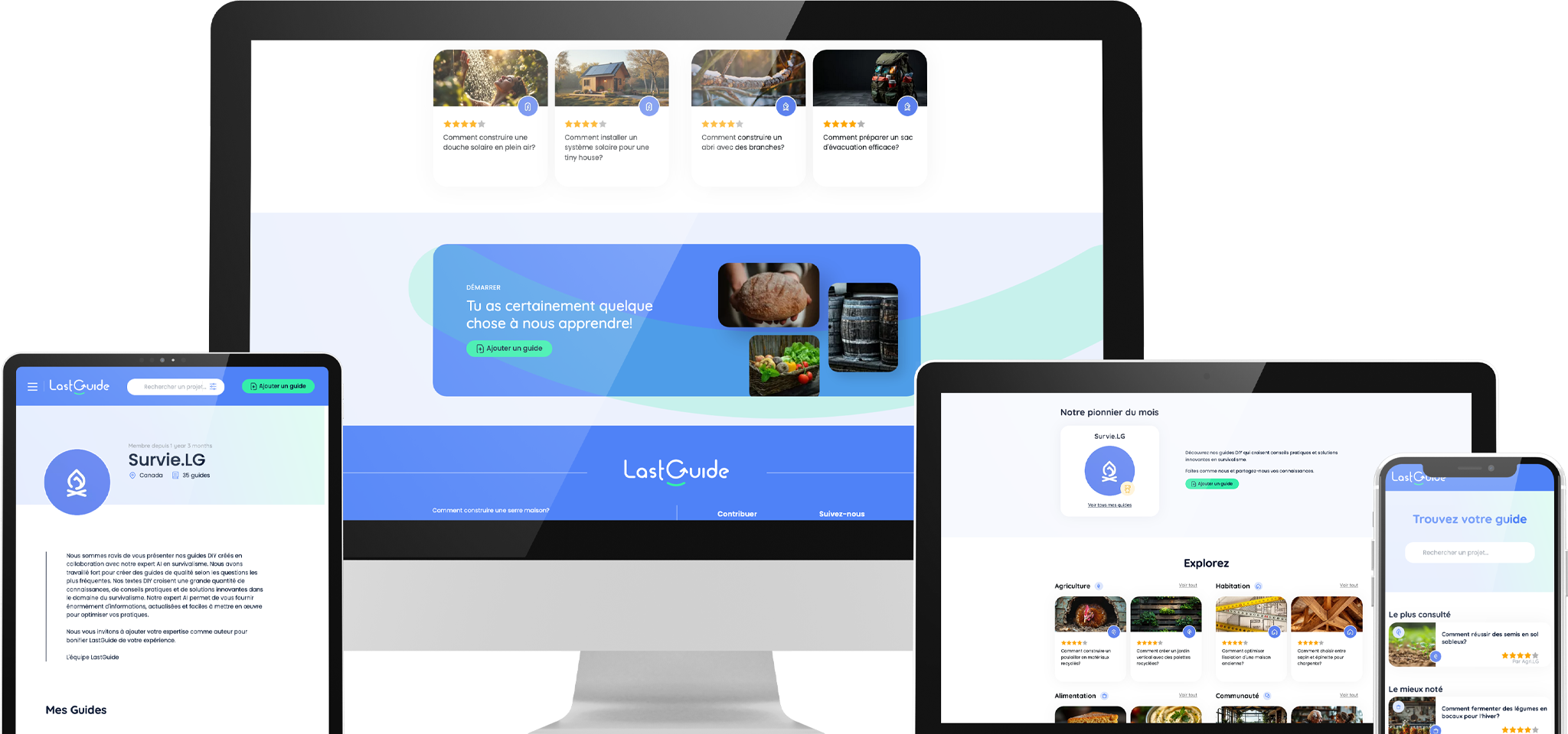 LastGuide met en relation des personnes recherchant l'autosuffisance et des modes de vie alternatifs à travers une plateforme collaborative de guides pratiques. Créer ce système de partage a nécessité de traduire des valeurs d'autonomie, durabilité et résilience communautaire en architecture fonctionnelle supportant des tutoriels générés par utilisateurs (survivalisme, solutions bas carbone, agriculture écologique, construction alternative) tout en maintenant qualité et organisation découvrable.